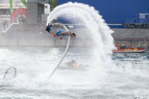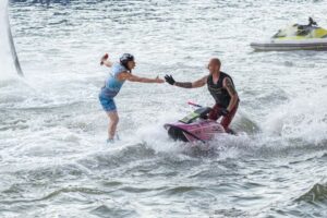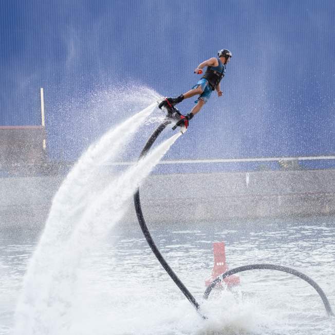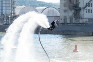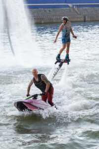 During the two-day festival, held on the river in the port of Stuttgart, we presented daytime synchronized performances, freestyle flyboarding battles, and jet ski freestyle. The team included riders Artur Zakrzewski, Przemysław Piotrowiak, and Kornel Babilec, and dancers Tatiana Zakrzewska and Nadia Fedorowa.